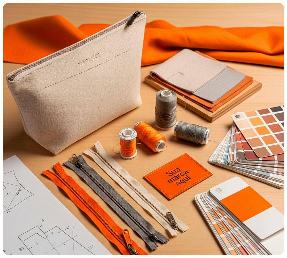 Desenvolvemos a modelagem do zero, definindo proporções, compartimentos e selecionando materiais que reforçam seu posicionamento: lona premium, sarja, nylon técnico e opções sustentáveis, além de detalhes como forros, viés, ferragens e zíperes na cor certa.
